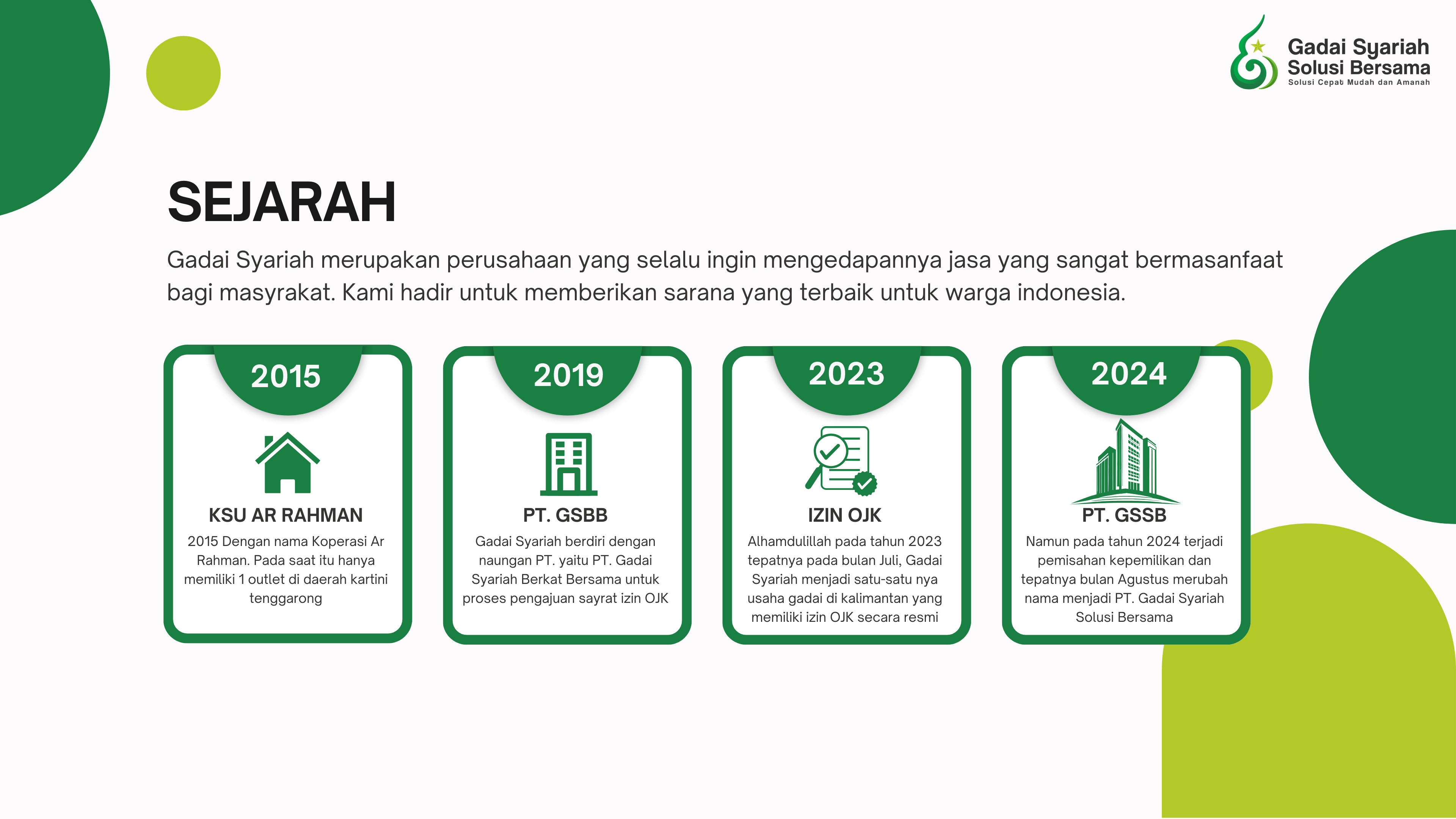 Gadai Syariah GSSK & GSSM adalah unit usaha dari PT Pergadaian Syariah Solusi Bersama yang mengadopsi prinsip-prinsip syariah dalam operasionalnya. Perusahaan ini merupakan perusahaan yang selalu ingin mengedepankannya jasa yang sangat bermanfaat bagi masyarakat, dan kami hadir untuk memberikan sarana yang terbaik untuk warga indonesia